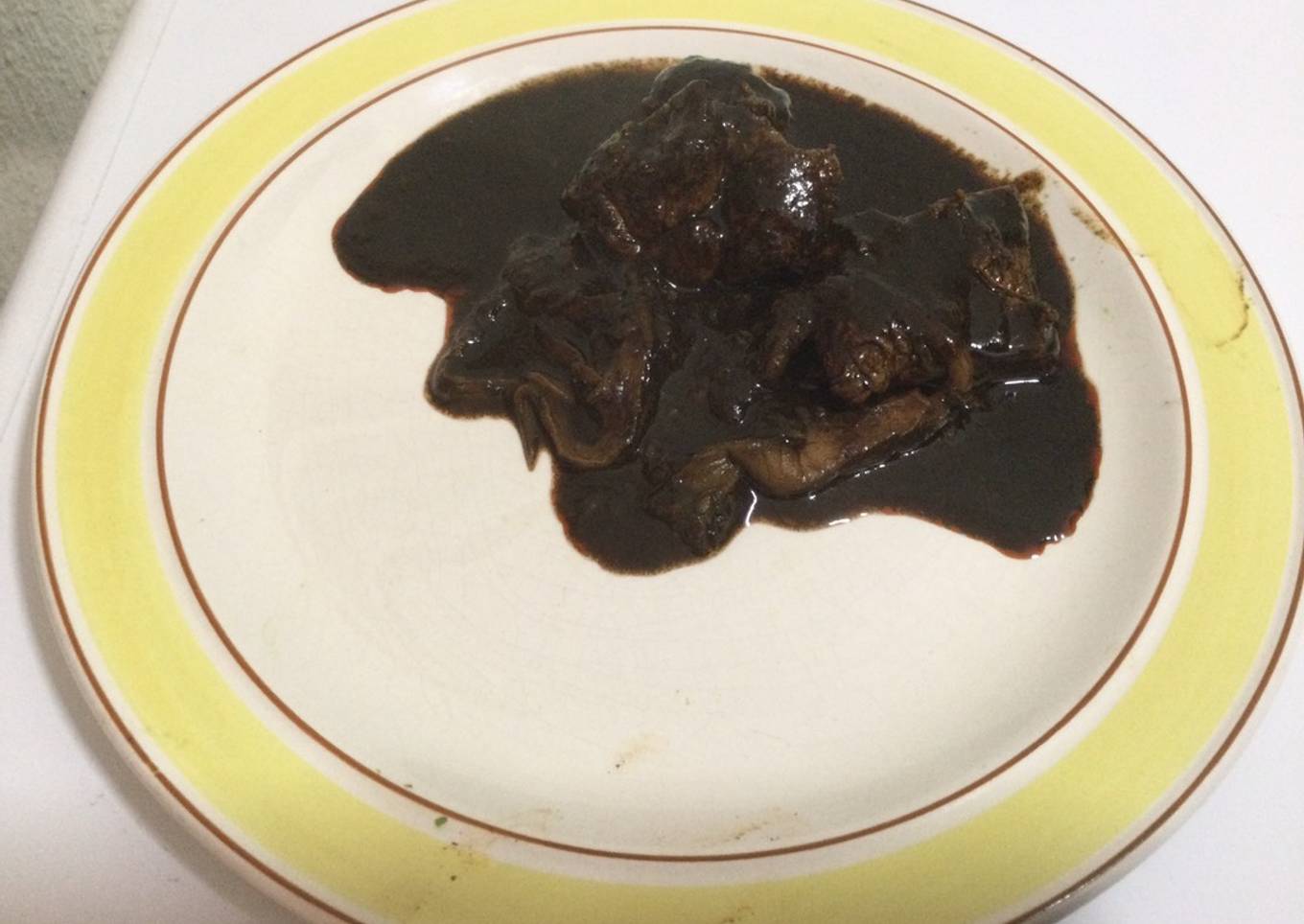 - En otra cazuela se pone a freír el mole y se le agrega agua o caldo de pollo, se disuelve muy bien que no tenga grumos. Cuidando que no quede muy aguado. Se le agrega la carne cocida y las setas. Se deja a llama baja hasta que hierva todo junto. Listo para servirse.