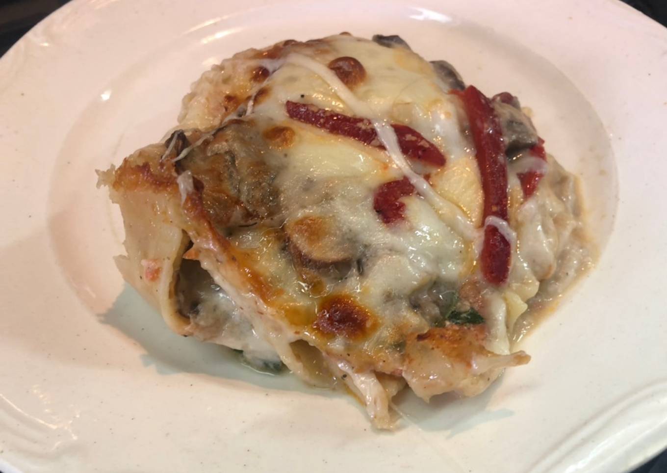 Una lasaña diferente, con champiñones, tocino, espinacas y salmón, para que disfrute tu familia y amistades