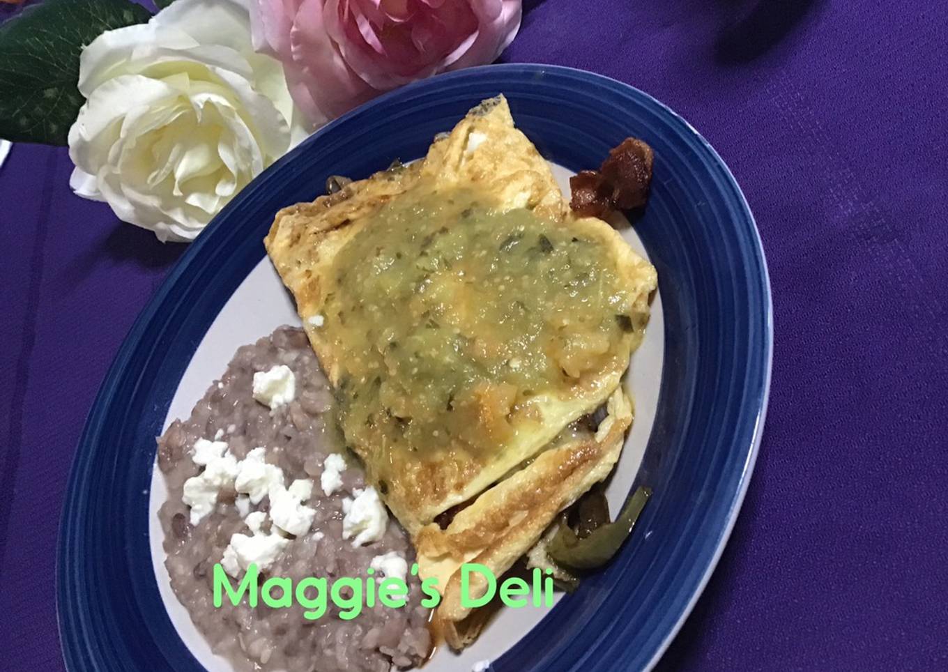 Omelette de tocino y pimientos bañada con salsa verde con habanero