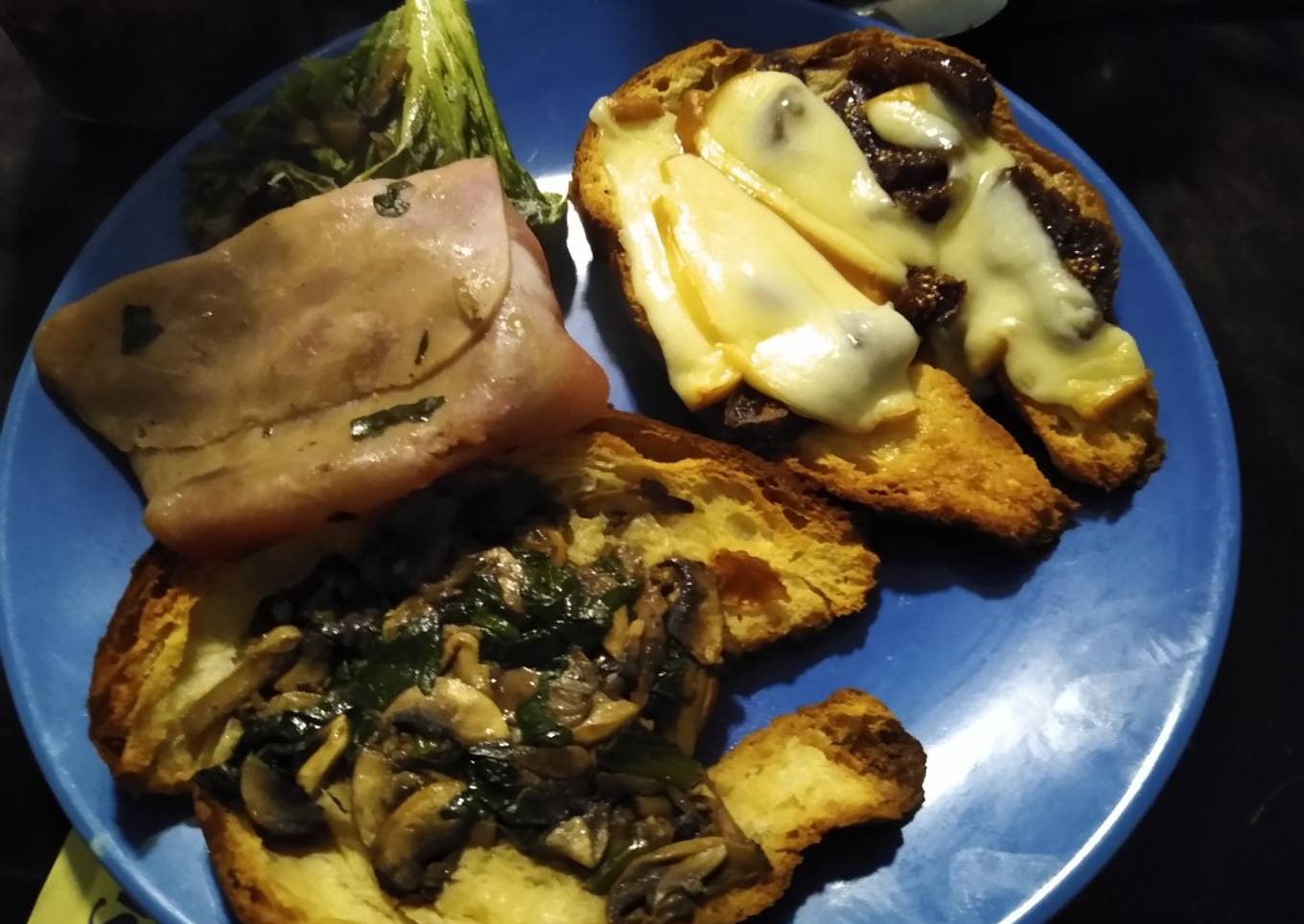 Cuernito con champiñones, espinacas, jamón, queso provolone e higos