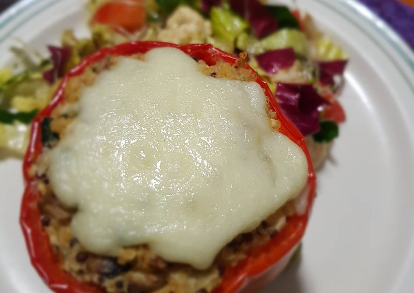 - Por último incorporar la quinoa. Colocar los pimientos en la rejilla de la freidora y rellenar con la mezcla, que quede bien compacta para que quepa todo el relleno.
