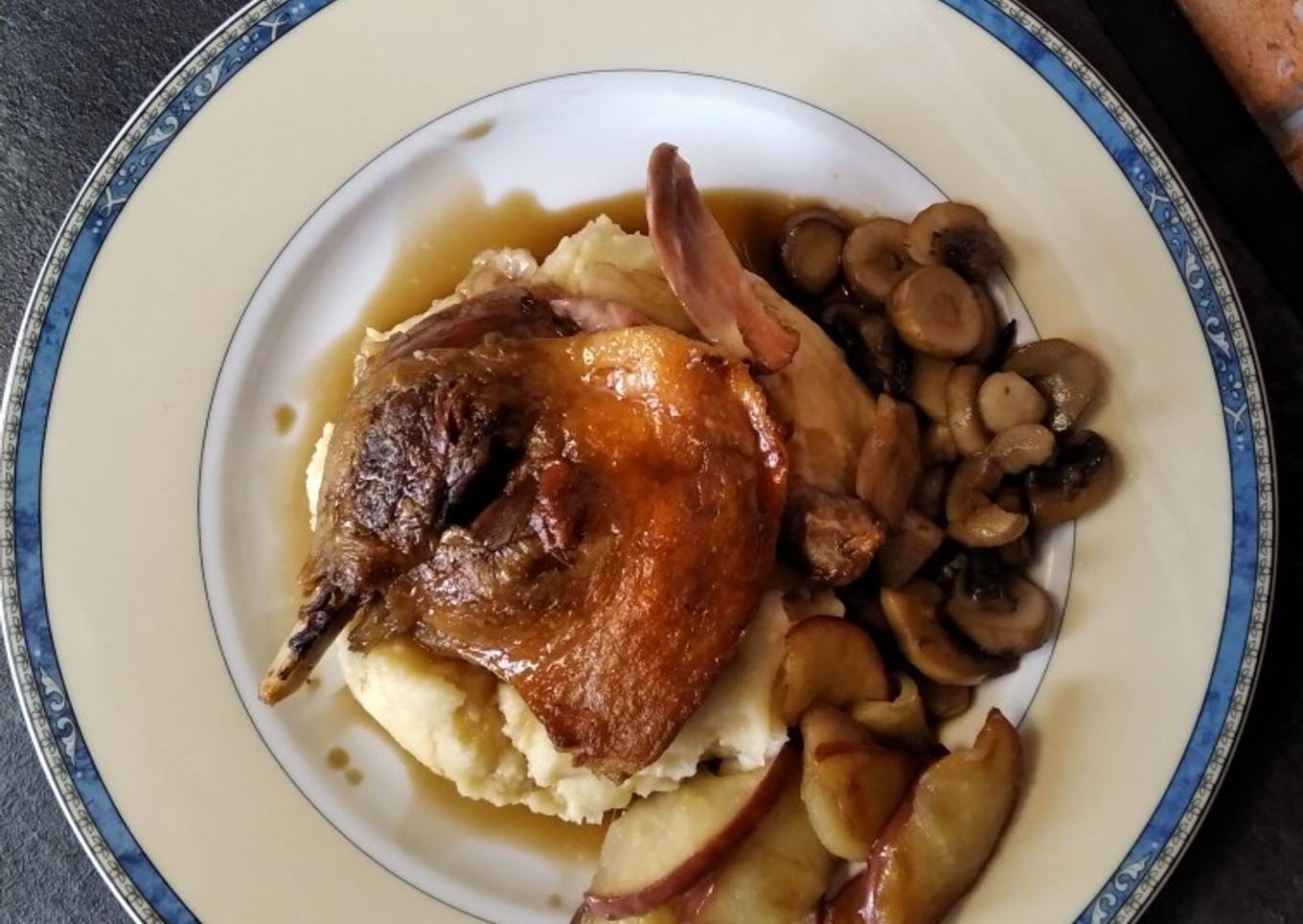 Confit de pato con manzana y champiñones