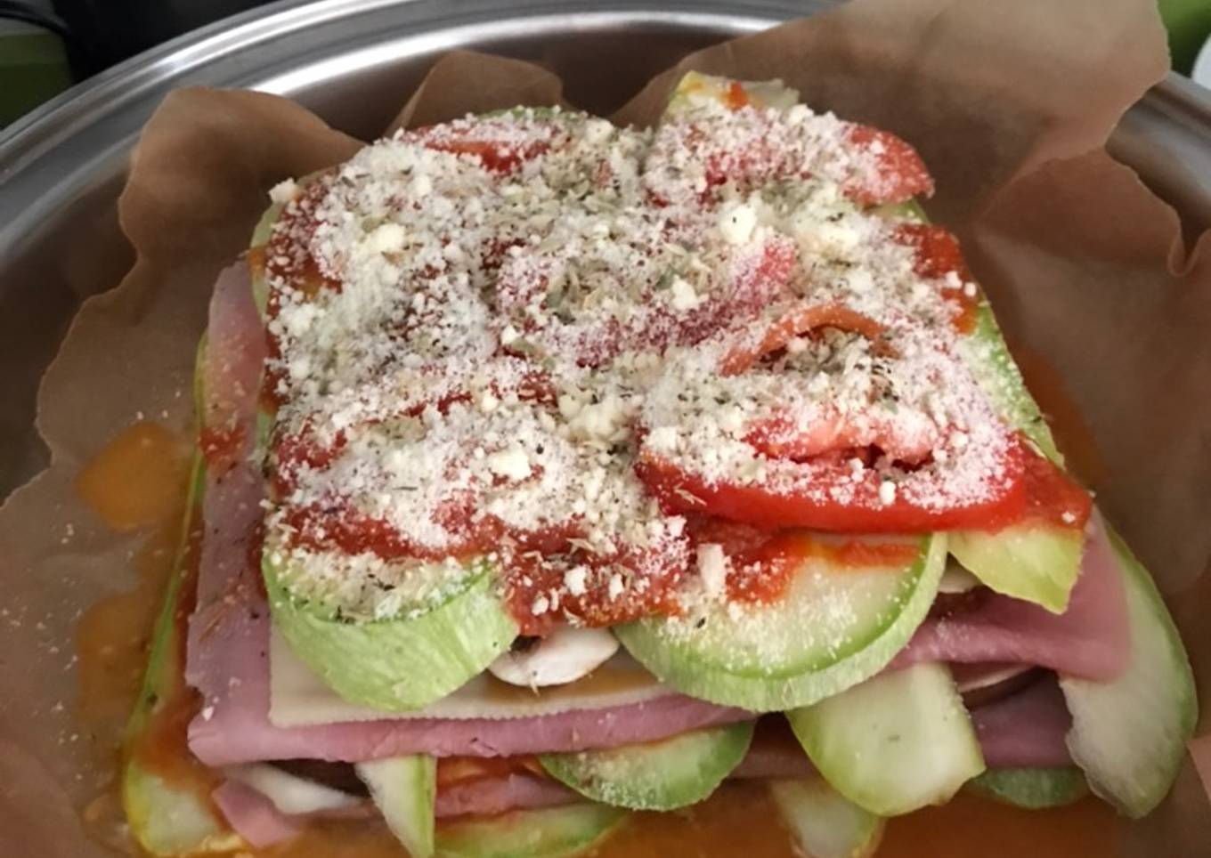 - Ir colocando capas: 1° calabacín y champiñón, 2° tomate frito, 3° jamón, 4°queso en lonchas