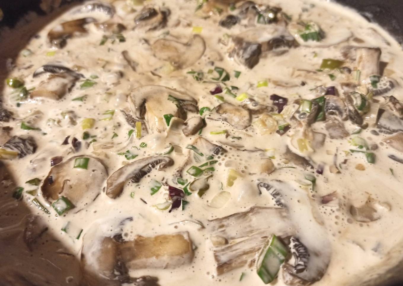 - Cuando los champiñones están dorados agregamos la parte verde de la cebolla y la salsa de soja. Mezclamos y añadimos finalmente la crema.