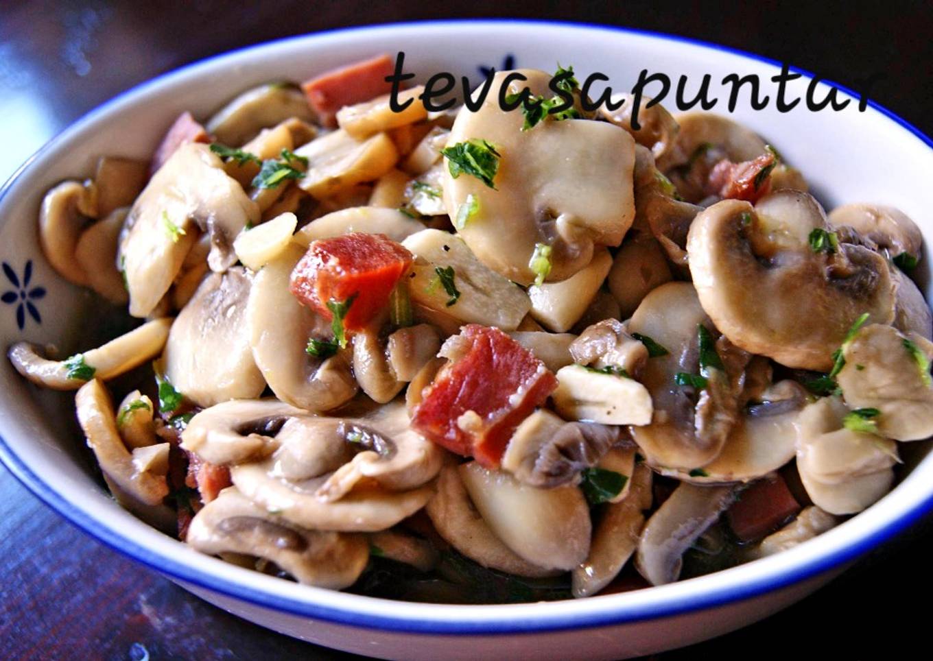 Ponemos una sartén amplia con fondo de aceite y añadimos los ajos picados y la gundilla, cuando comiencen a bailar añadimos el vino y dejamos evaporar el alcohol, añadimos los champiñones y el jamón, sal y pimienta y cocinamos unos minutos.No poner mucha sal porque el jamón ya lleva y nos podemos pasar. - Apartar del fuego y servir con perejil picado.Para tapear o como guarnición de carnes y pescados es ideal, seguro que Tevasapuntar.