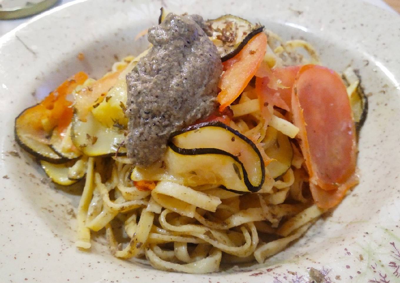 Fetuccine al horno con calabacín, tomate y crema de champiñón