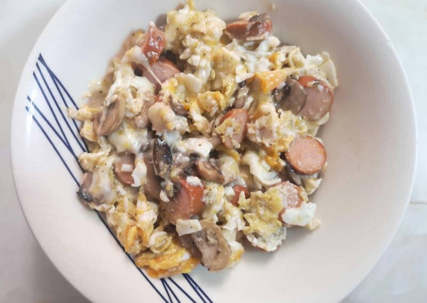 Steps to make to make Huevo revuelto con champiñones, salchicha y queso