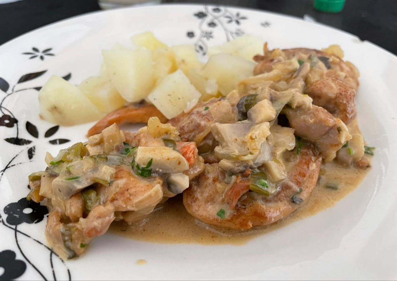 - Pico los champiñones y coloco a la cebolla. Luego de unos minutos agrego vino y subo el fuego para que evapore. Luego agrego la crema de leche y condimento con sal y pimienta a gusto. Una vez que calienta paso toda la salsa al sartén dónde está el pollo y pongo fuego al mínimo y dejo cocinando el pollo unos 5 a 7 minutos en la salsa. Por último agrega las hierbas frescas antes de servir