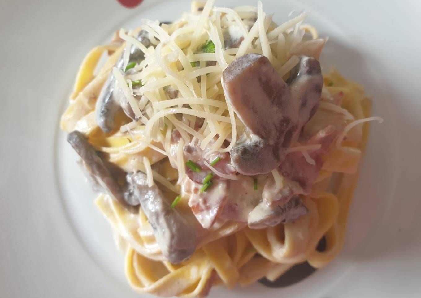 Luego los colaremos y los añadimos a la salsa de carbonara de champiñones y le agregaremos un cazito de agua sobrante de los tagliatelle para que se aligere la salsa. Emplatamos, añadiendo un poco de queso emmental y listooo para comer. Que aproveche👌😉