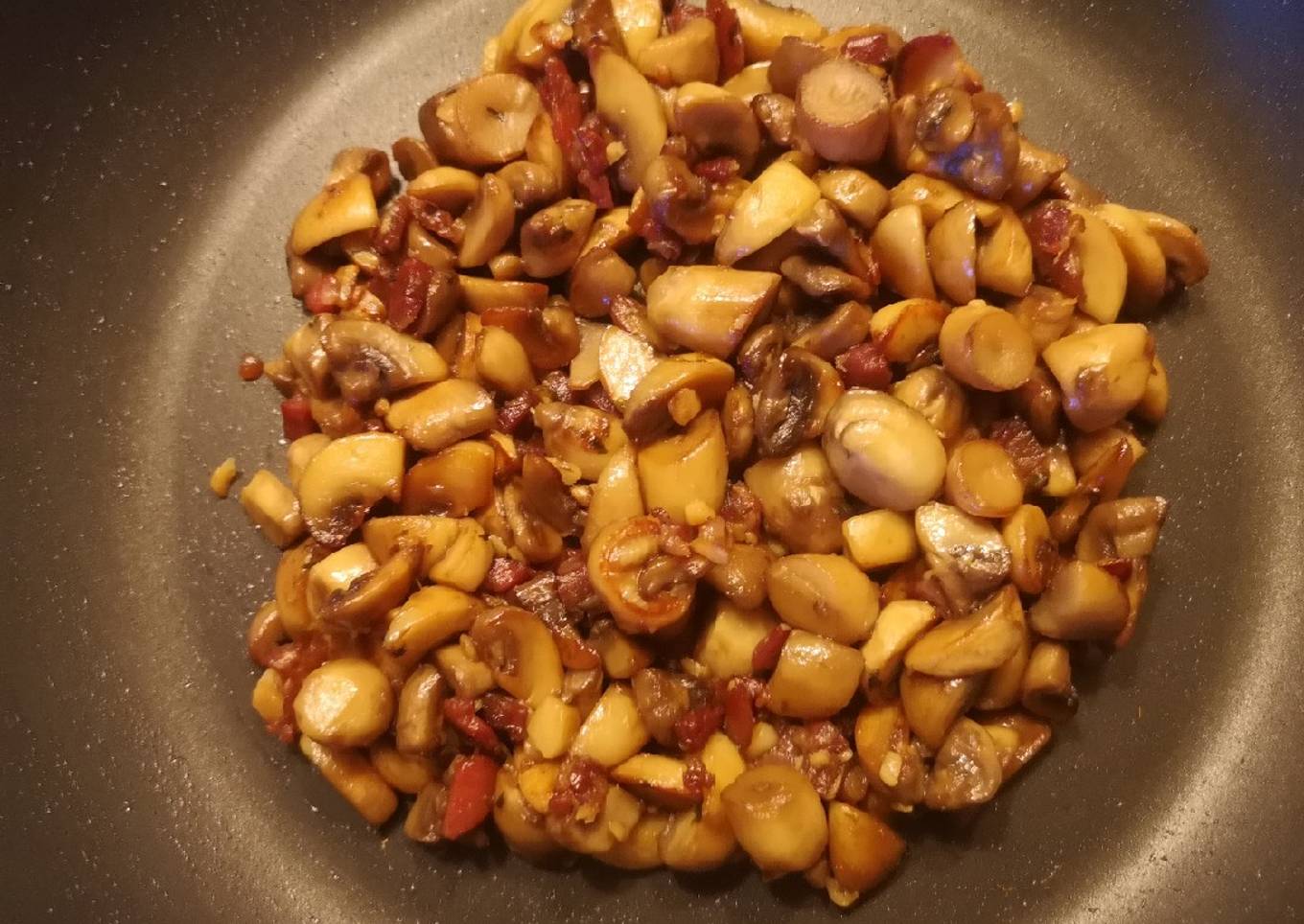 - Seguimos haciendo hasta que se absorba todo el líquido y se empiece a dorar el jamón. Los champis habrán absorbido los sabores y añadir el perejil picado. Añadir como último la sal por lo que haya podido soltar el jamón. Dar un par de vueltas y listo!!