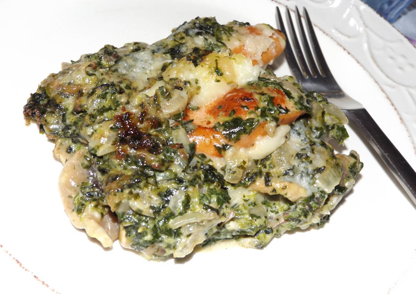 - Cortar los champiñones en rodajas y rehogar con la cebolleta durante 5´. Incorporar la espinaca. Cocer la patata en agua con sal y hacer un puré con mantequilla, leche y nuez moscada. Colocar en una fuente de horno engrasada con mantequilla.