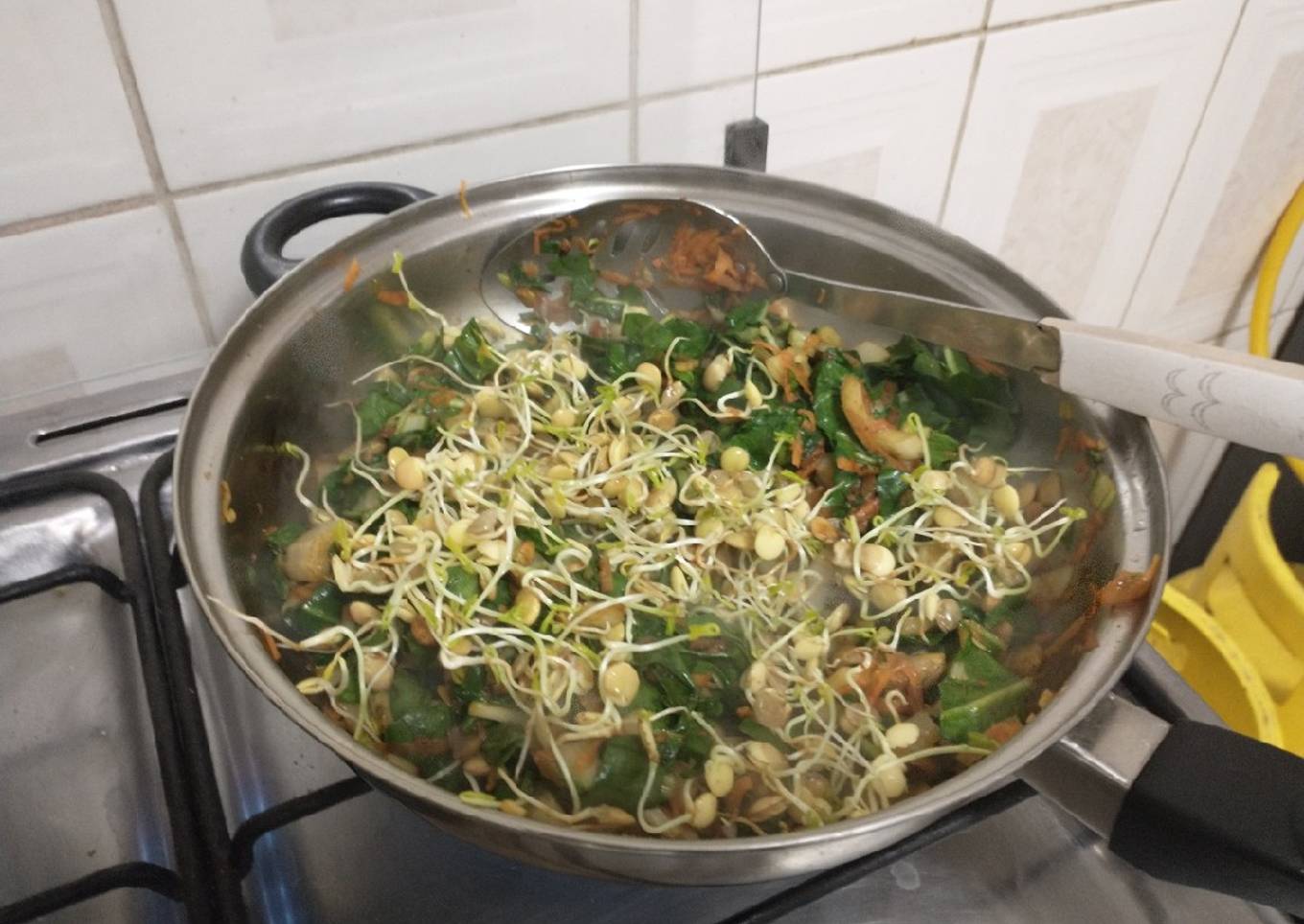 - Transcurridos unos 2 minutos rectificar el sabor y la sal y justo al final añadir los germinados y apagar el fuego, lo ideal es no cocinarlos, remover y listo, un salteado o guiso de acelgas con sabor asiático.