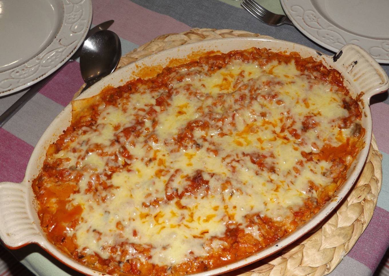 - Engrasar una fuente de horno y colocar en el fondo las placas de lasaña. Se ponen sólo en el fondo para evitar que se le desmorone el pastel al 200ºC durante unos 40´. Servir de inmediato.