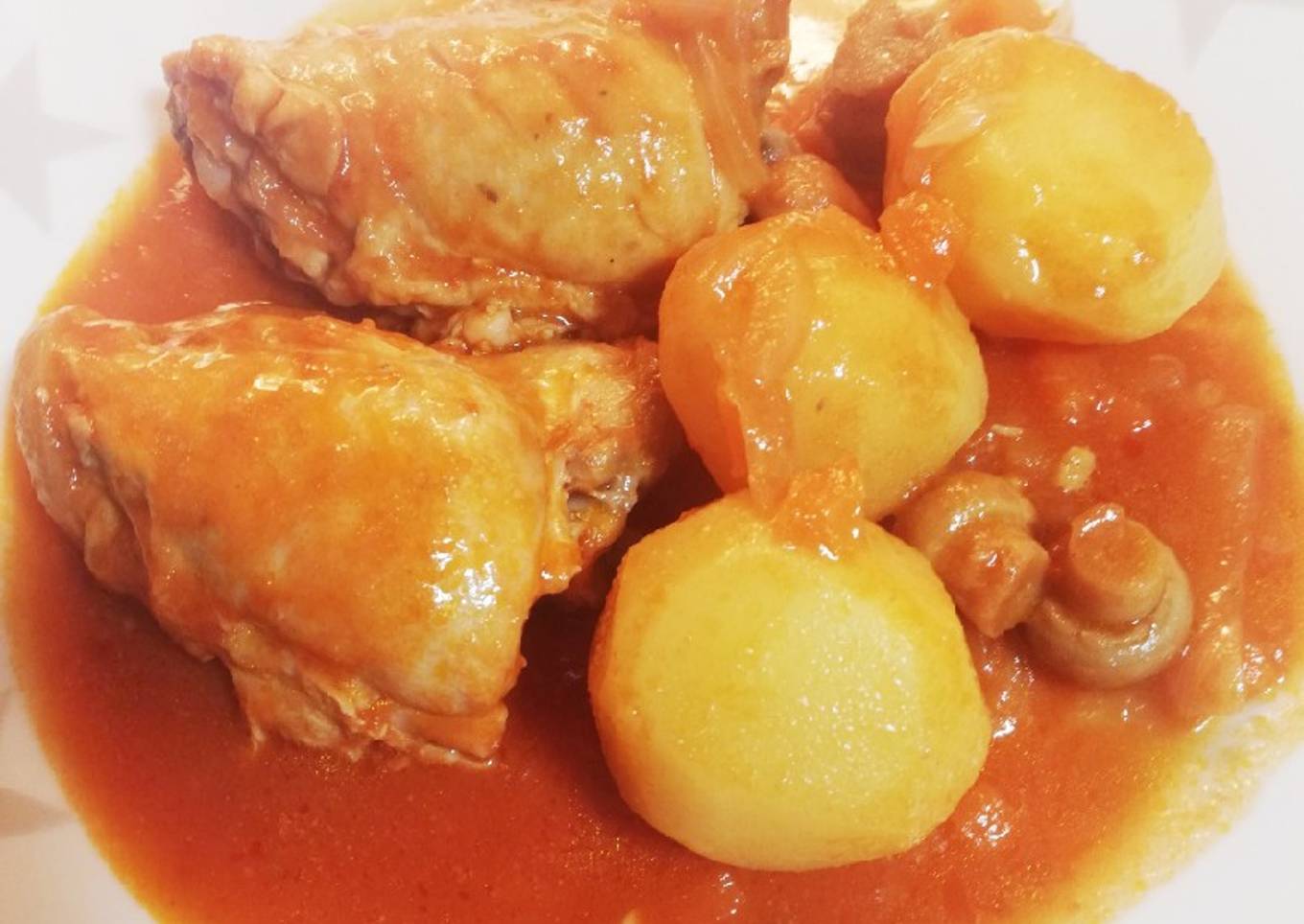 Pollo guisado con champiñones y patatinos