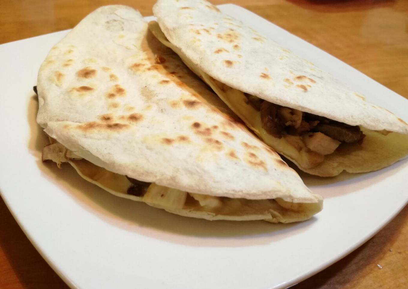 - Picar la pechuga asada en cubitos, y el ciboulette pequeñito. Poner a calentar la tortilla en un sartén antiadherente sin materia grasa, disponer encima pollo y champiñones a gusto por una mitad, luego queso rallado mantecoso y ciboulette, cerrar la tortilla a la mitad, sellar por unos dos min, dar la vuelta y dorar por el otro lado dos min más, mientras se derretirá el queso en incorporarán los sabores!