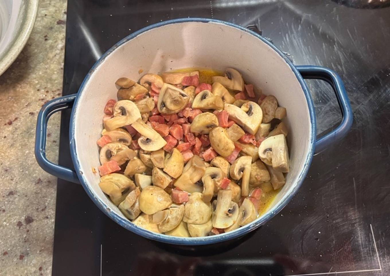 - En una cazuela con un chorro de aceite oliva ponemos a saltear el ajo con el jamón. Mientras, troceamos el champiñón al gusto.
