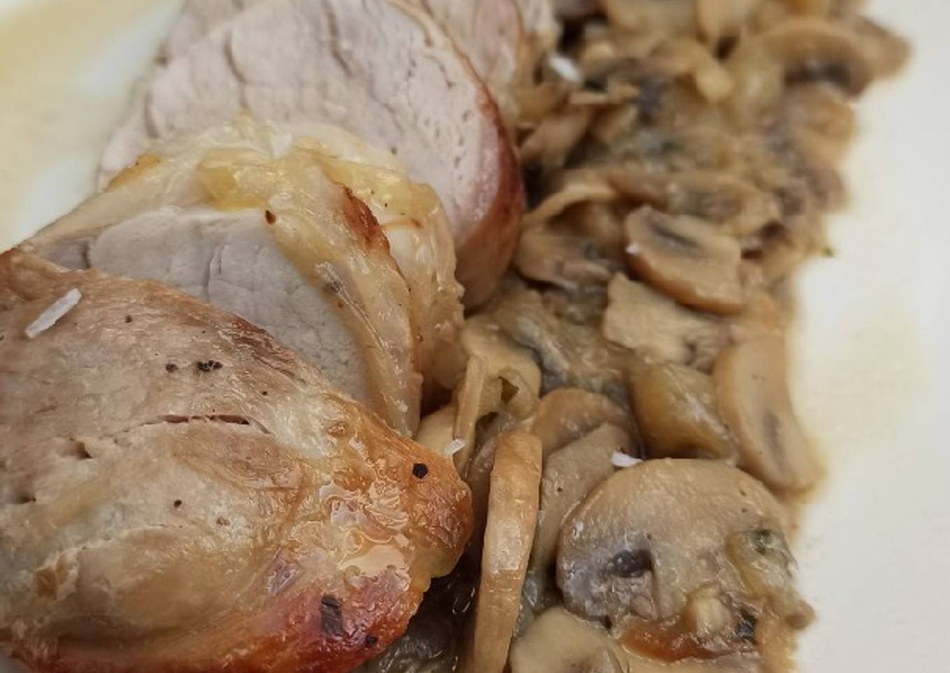 - Dejar que reduzca unos minutos y echar la salsa de cebolla y champiñones a la fuente donde está el solomillo de cerdo.