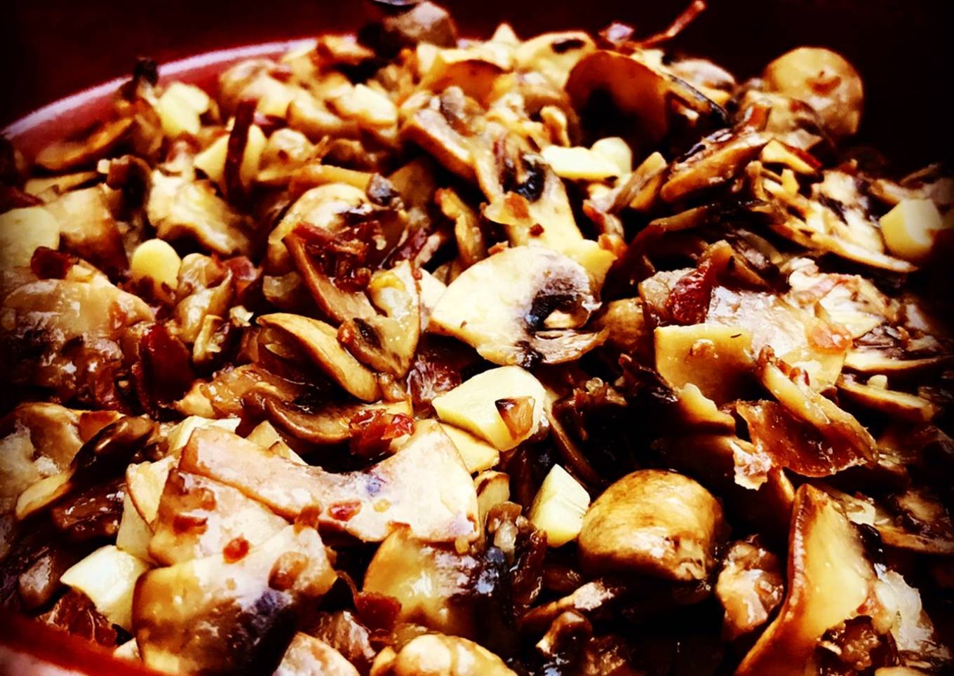 - Después añade los champiñones. Irán soltando agua hasta reducir 2/3 de su tamaño. Es momento de añadir el vino, el vinagre y la cayena triturada. Saltea y cuando reduzca el vino retira de la sartén. Prueba y corrige de sal al gusto.